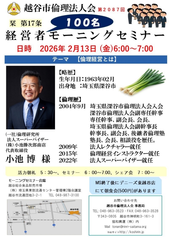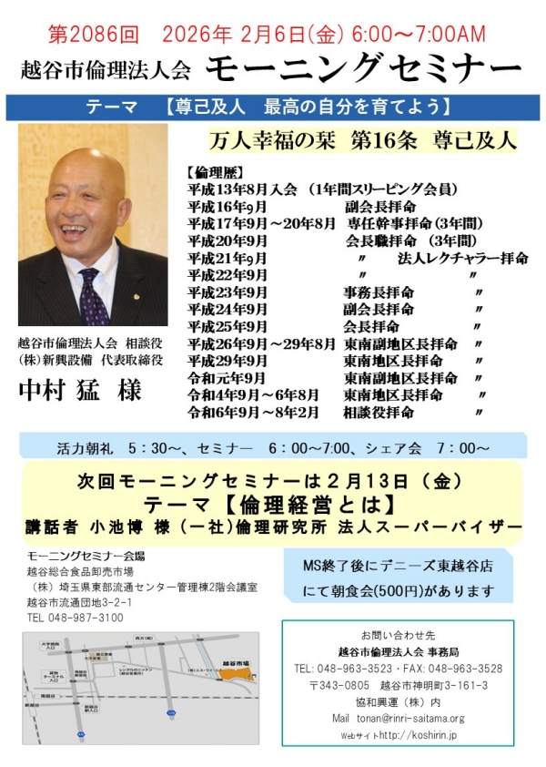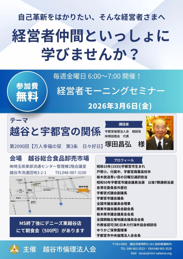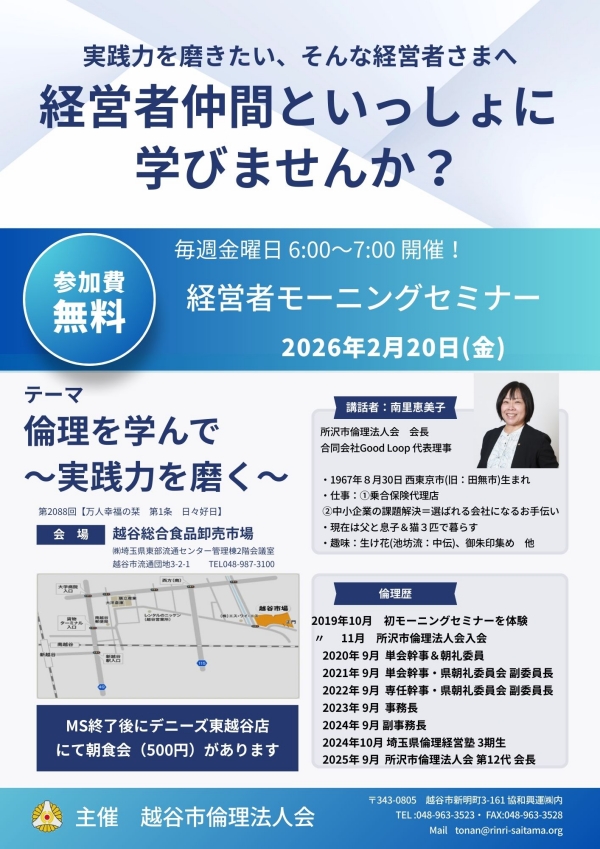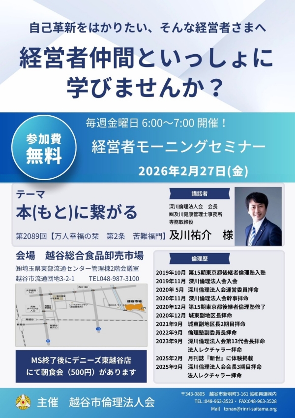 朝型の生活習慣を体得するとともに、会員同士の交流・情報交換の場として、倫理法人会活動の柱となっています。詳細はこちら